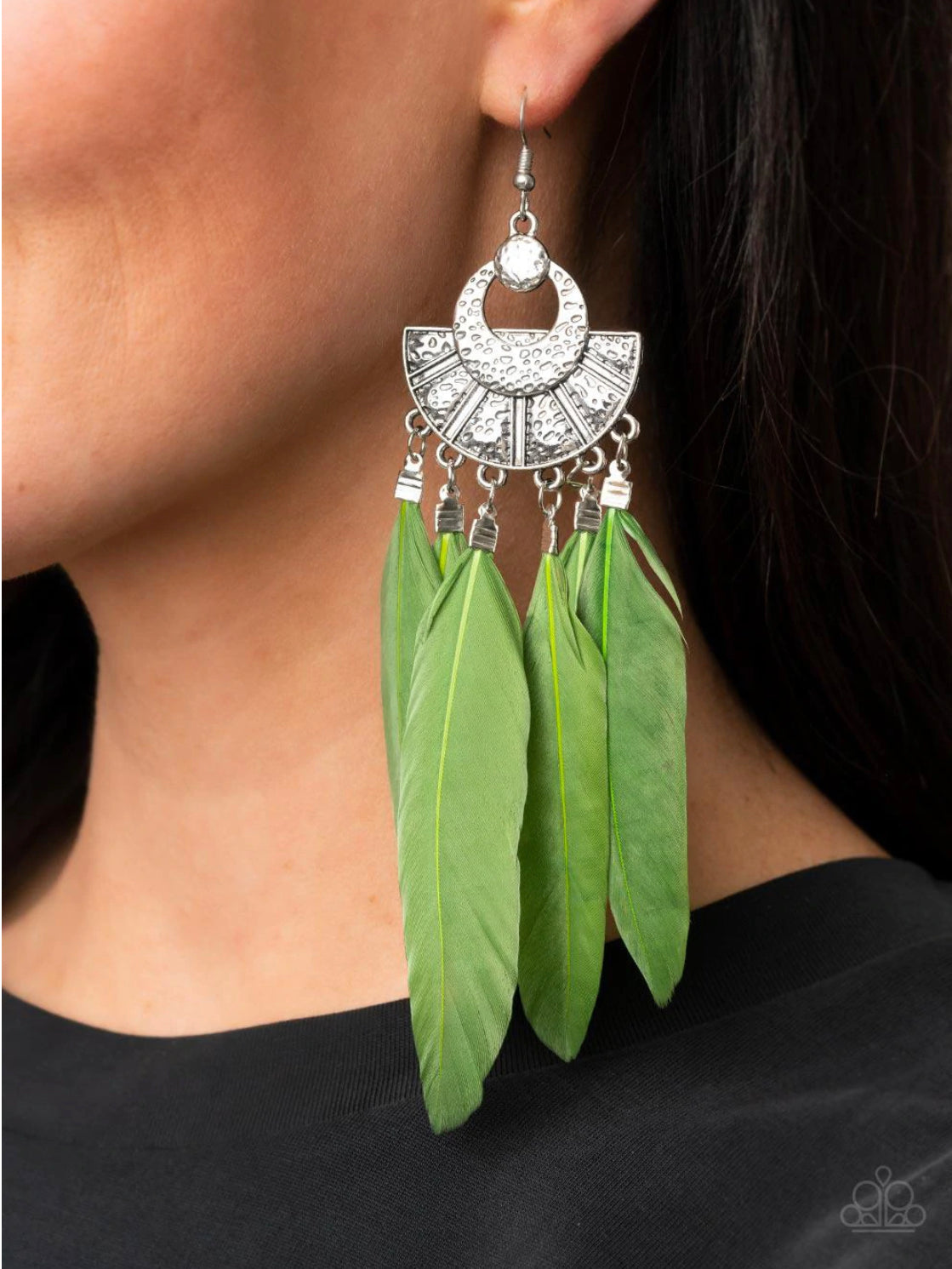 Oversized red feathers swing from the bottom of an ornately hammered and stacked silver frame, resulting in a flirtatiously colorful fringe. Earring attaches to a standard fishhook fitting.